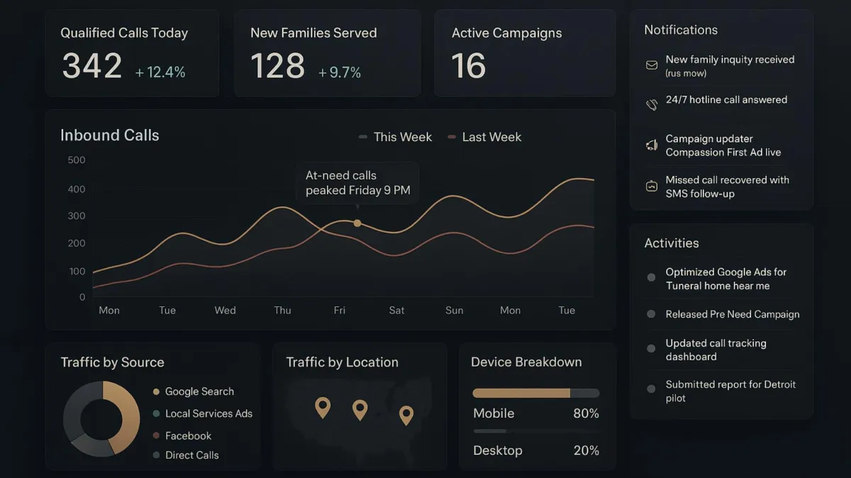 We run call-first digital lead generation programs. That means Google search campaigns optimized for phone calls, local listings and maps work, simple landing pages, missed-call recovery (SMS/IVR), and a compassionate messaging strategy designed for funeral care. We also provide call tracking, basic CRM/calendar integration, and monthly reporting.
